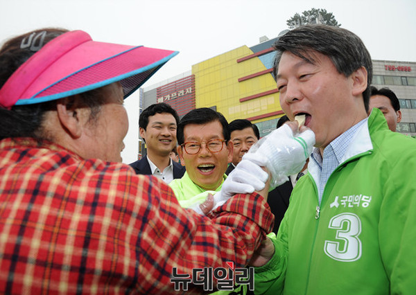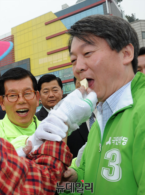 국민의당 안철수 공동대표가 9일 오전 경기 성남시 중원구 모란시장에서 열린 성남지역 후보 합동지원유세 나선 가운데 한 상인이 권하는 엿을 받아먹고 있다.