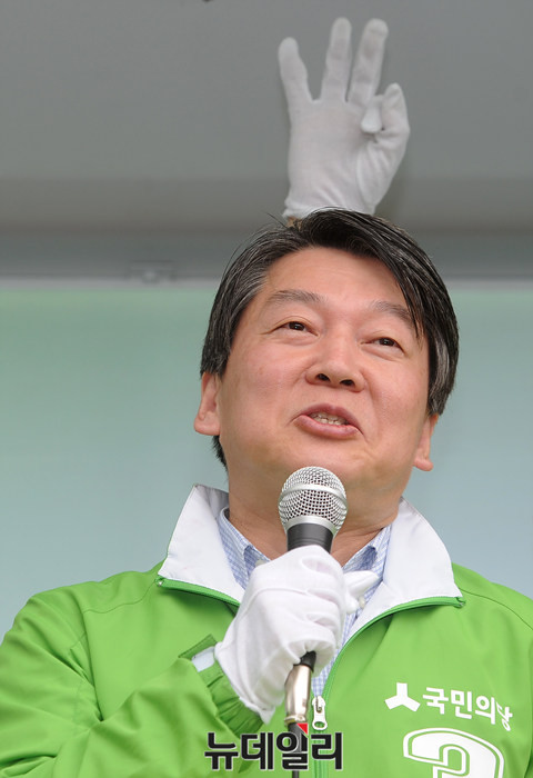 국민의당 안철수 공동대표가 9일 오전 경기 성남시 중원구 모란시장 입구에서 열린 성남지역 후보 합동유세에서 지지를 호소하고 있다.