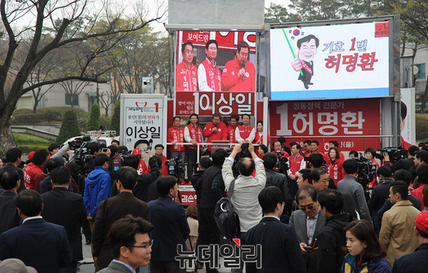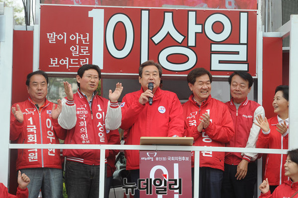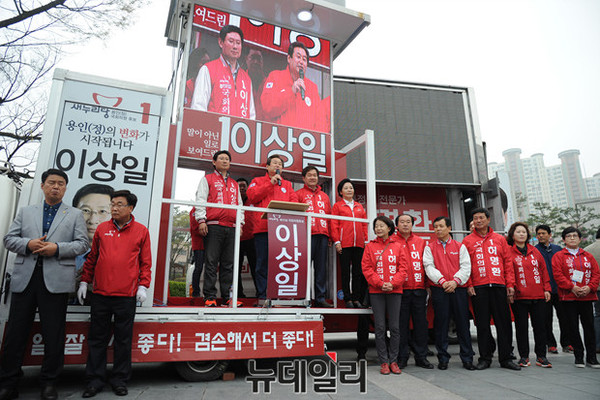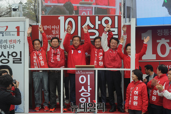 새누리당 김무성 대표가 9일 오후 경기 용인시 죽현마을 중앙공원에서 열린 용인 이우현(용인갑) 허명환(용인을) 한선교(용인병) 이상일(용인정) 지원유세에서 지지를 호소하고 있다.