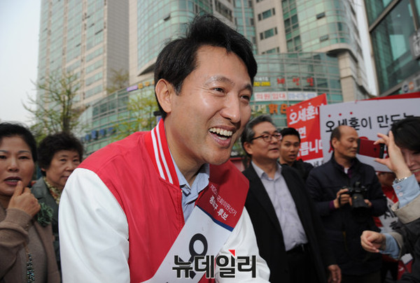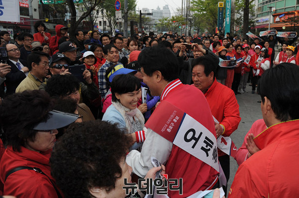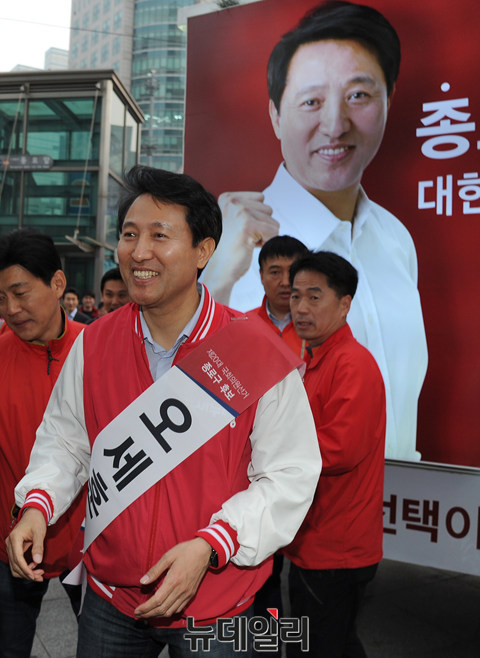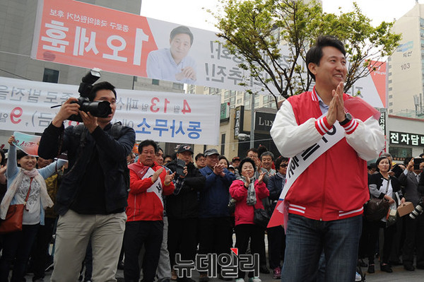 새누리당 오세훈(종로구)후보가 10일 오후 서울 종로구 지하철 동묘역 앞에서 열린 거점 유세에 앞서 시민들과 인사를 하고 있다.