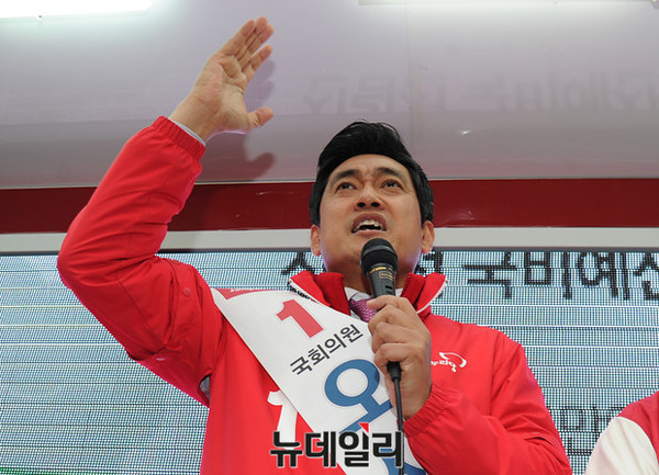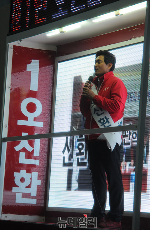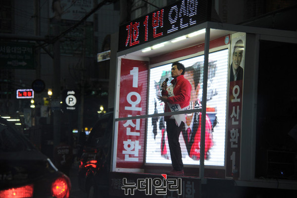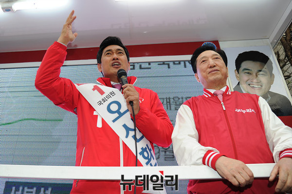 새누리당 오신환(관악을)후보가 11일 오후 서울 관악구 신림역 인근에서 열린 차량유세에서 새누리당 김철수 비례대표 후보와 함께 지지를 호소하고 있다.