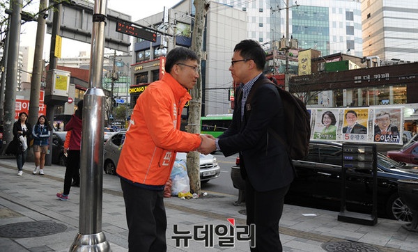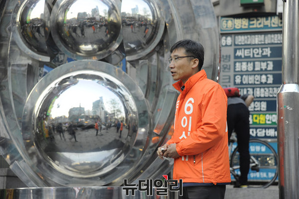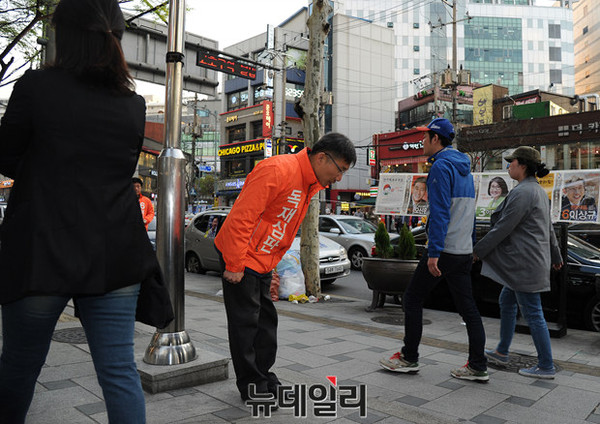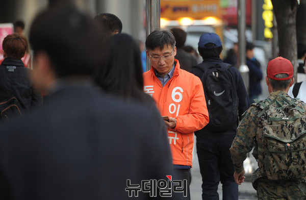 민중연합당 이상규(관악을)후보가 11일 오후 서울 관악구 신림역 인근에서 퇴근길 시민들에게 지지를 호소하고 있다.