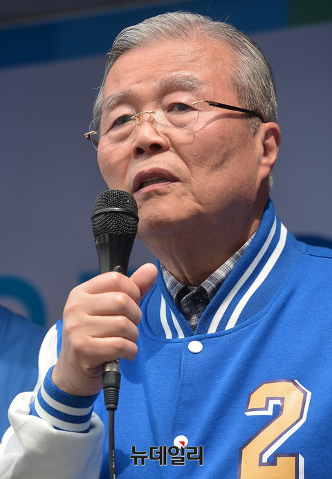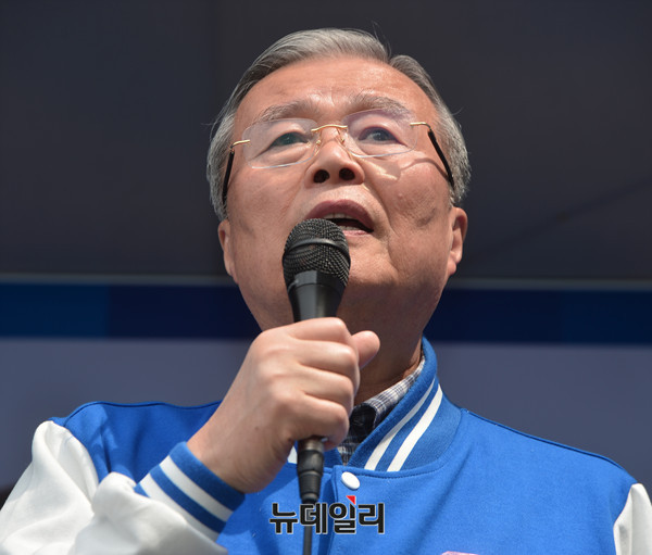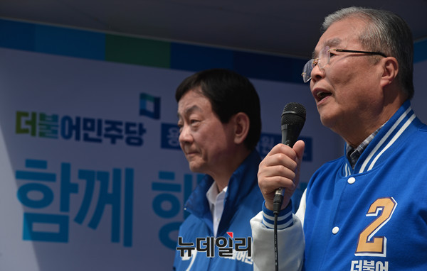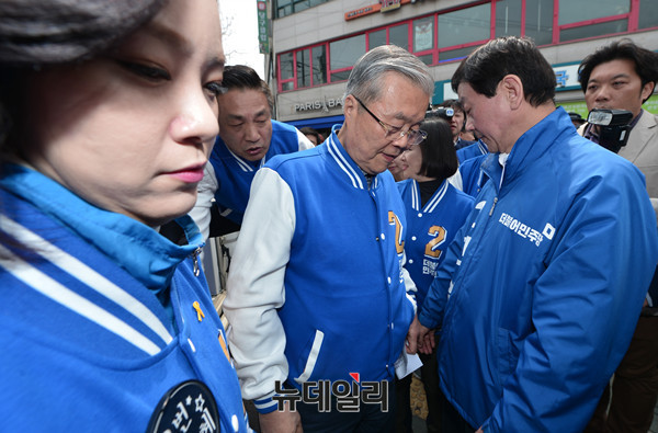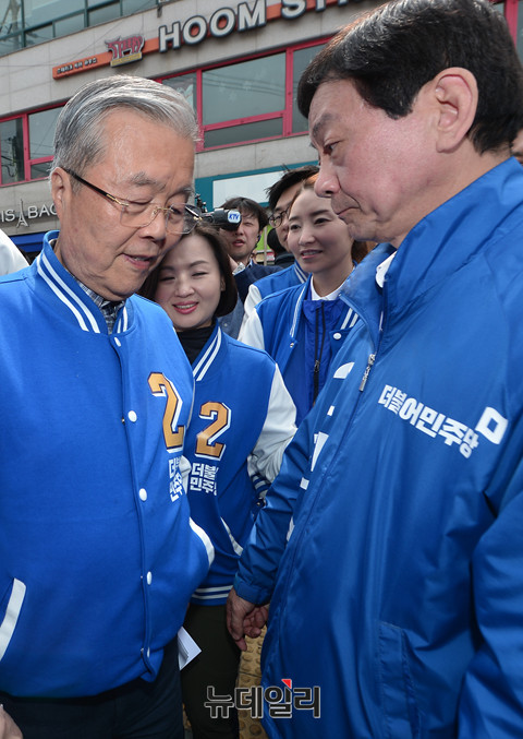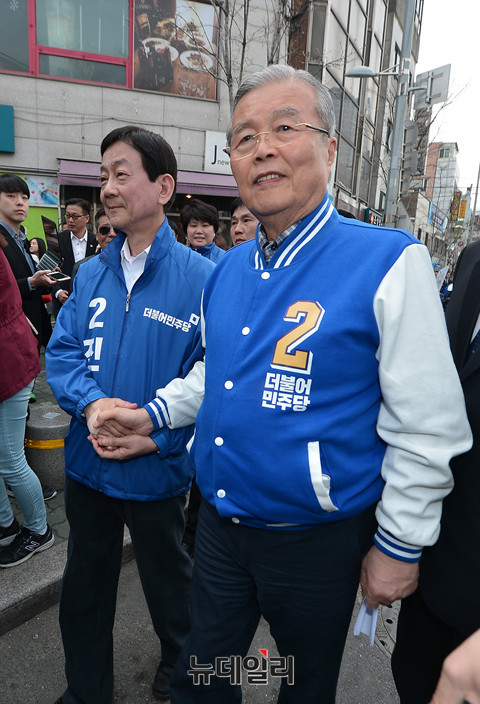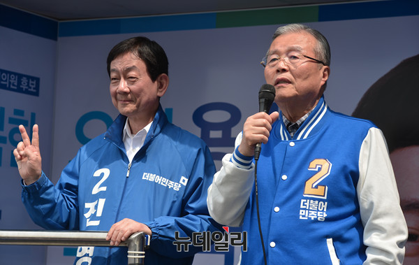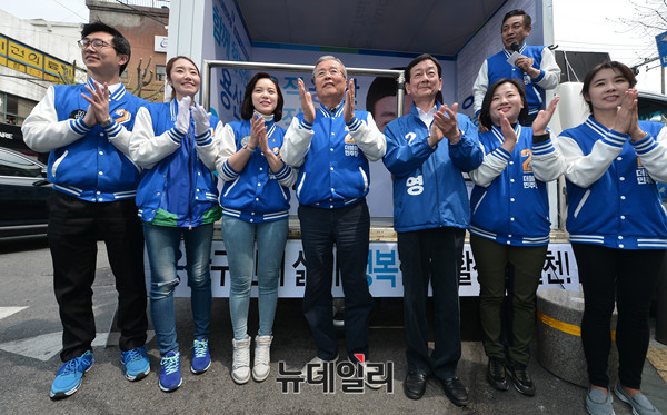 더불어민주당 김종인 비상대책위원회 대표가 12일 오후 서울 용산구 후암시장 입구에서 열린 더불어민주당 진영 후보 유세장을 방문해 지원유세를 이어갔다. 김 대표가 독일 유학시절 친구에게 받았다고 주장한 고가브랜드 시계는 이날 착용하지 않았다.