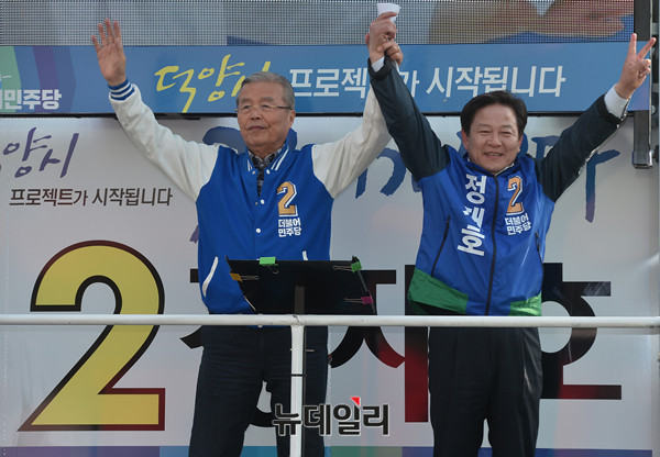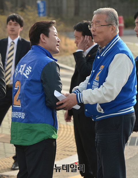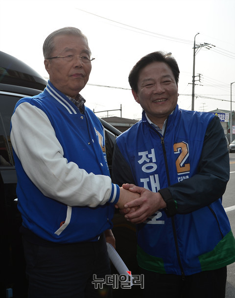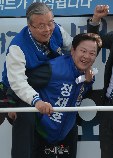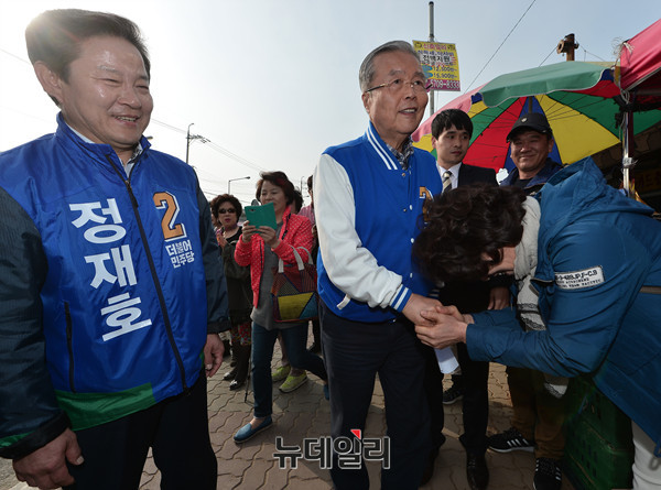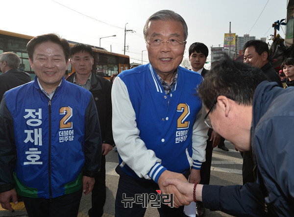 더불어민주당 비상대책위원회 김종인 대표가 4.13 총선을 하루 앞둔 12일 오후 경기 고양시 덕양구 능곡전통시장 입구에서 열린 정재호 후보 선거유세에 참석해 지지를 호소했다. 이날 정 후보는 김 대표를 업는 퍼포먼스로 필승을 다짐했다.