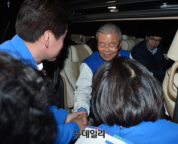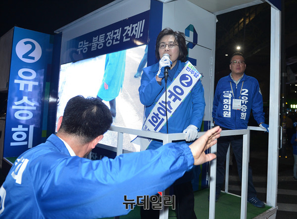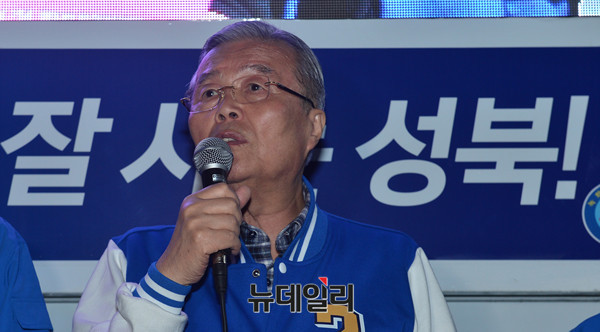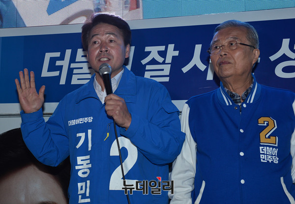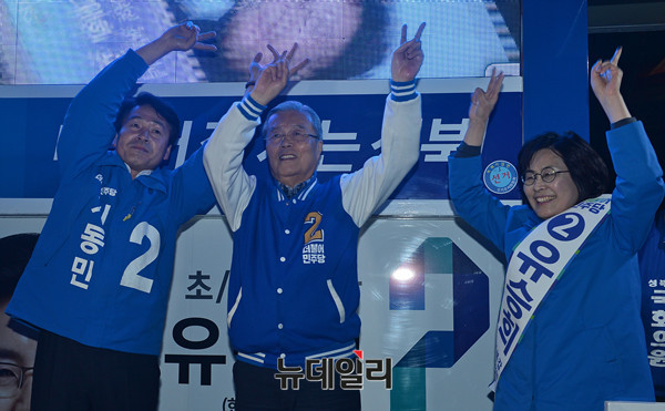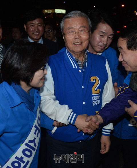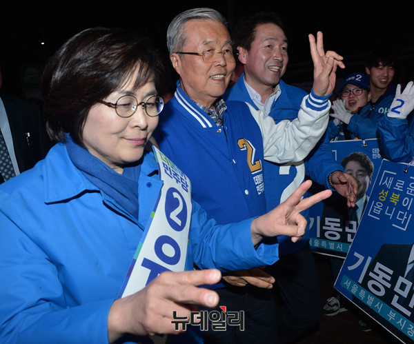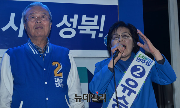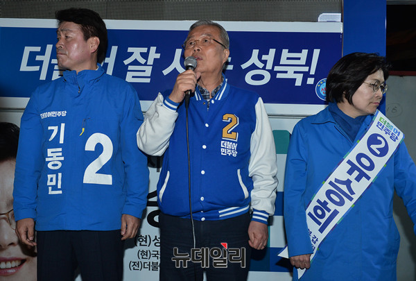 더불어민주당 김종인 비상대책위원회 대표가 12일 오후 서울 성북구 길음역에서 열린 유승희-기동민 후보 합동 유세장에 방문해 지원유세를 이어갔다. 이날 유 후보는 "내일 투표로 새누리당과 이명박, 박근혜 정권을 심판해달라"고 모인 유권자들에게 호소했다.
