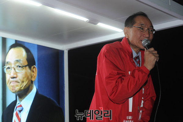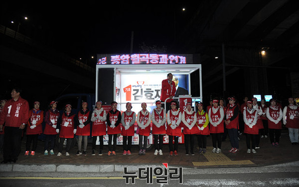 새누리당 김효재(서울 성북을) 후보가 12일 오후 서울 성북구 월곡역 홈플러스 광장에서 시민들을 향해 지지를 호소하고 있다.
