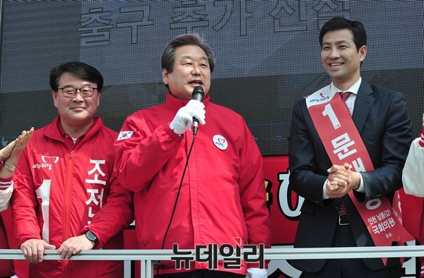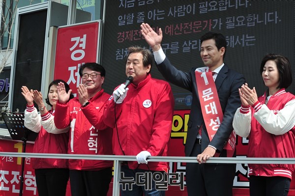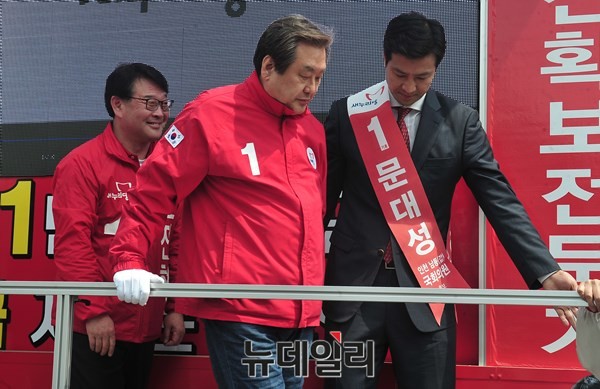 새누리당 김무성 대표가 4·13 총선을 하루 앞둔 12일 오후 인천시 남동구 서창지구 인근에서 열린 인천 남동을 조전혁, 인천 남동갑 문대성 후보의 합동유세장을 찾아 지지를 호소하고 있다.