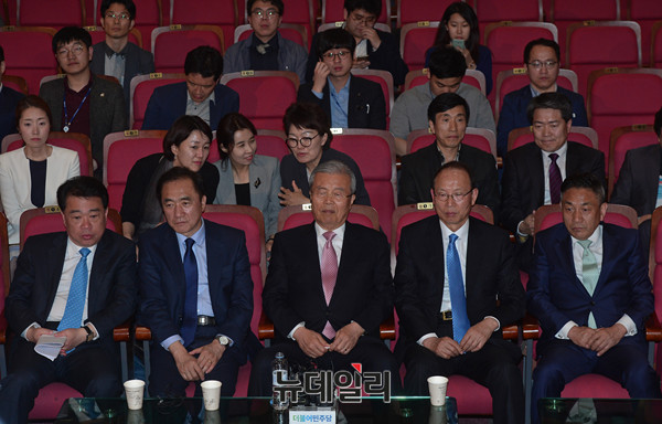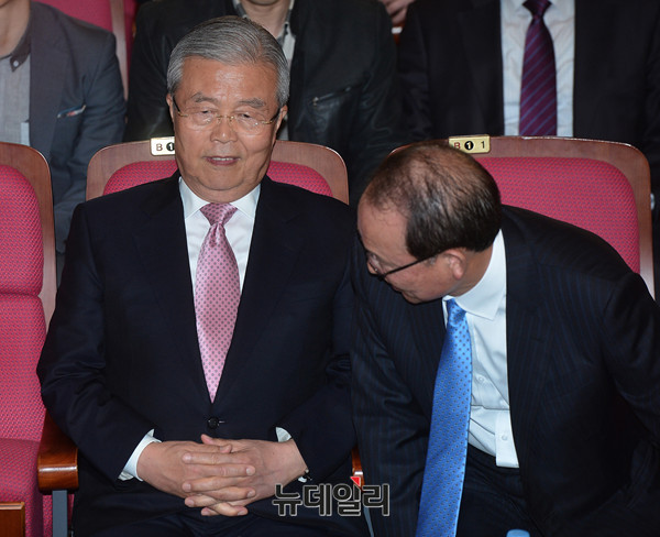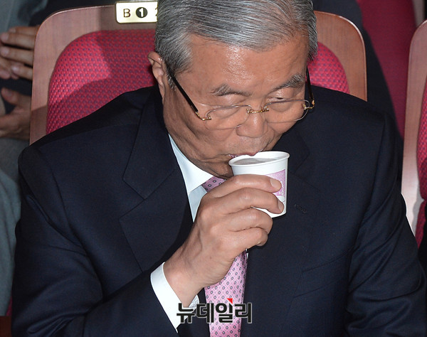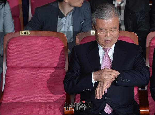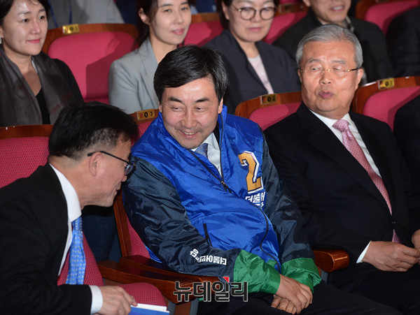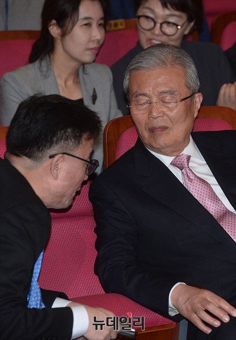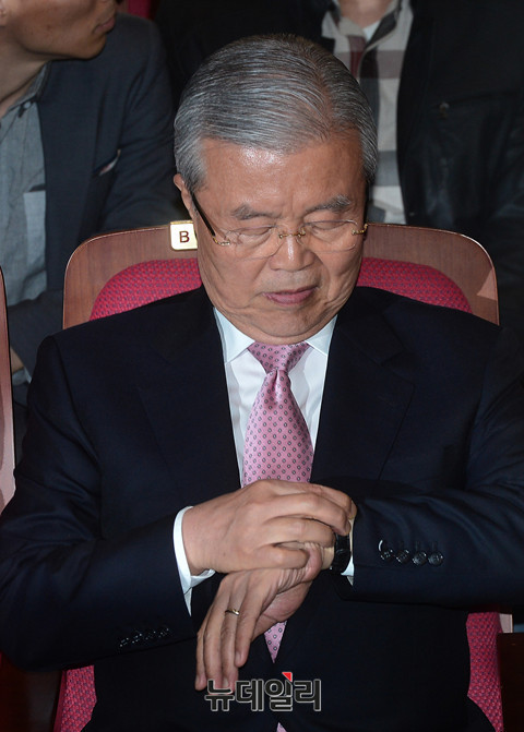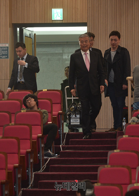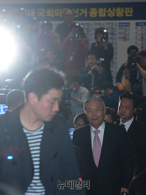 더불어민주당 김종인 비상대책위원회 대표가 13일 오후 10시께 국회의원회관 대회의실에서 진행되고 있는 개표상황을 보기 위해 다시 참석했다. 안양시 만안구에 출마한 이종걸 후보도 참석해 개표상황을 지켜봤다.