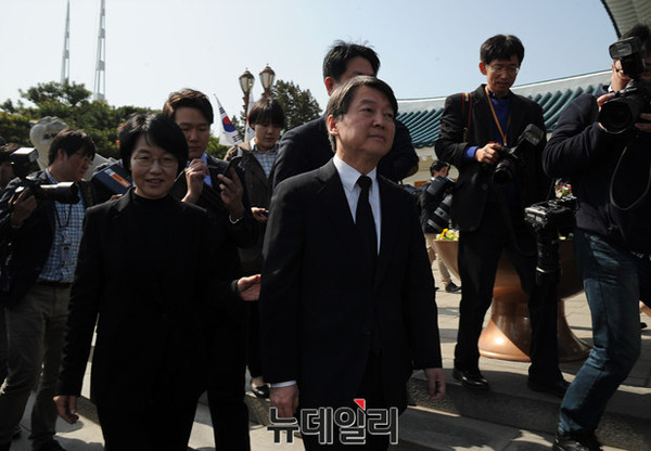 안철수 국민의당 상임공동대표가15일 오전 서울 동작구 국립서울현충원 참배를 마치고 현충원을 찾은 시민들을 향해 손을 흔들고 있다.