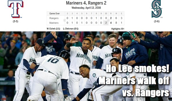 이대호는 한국시각으로 14일 미국 워싱턴주 시애틀 세이프코필드에서 열린 텍사스 레인저스와의 홈경기에서 연장 10회말 대타로 출전해 경기를 매조지하는 큼지막한 홈런포를 쏘아 올렸다.