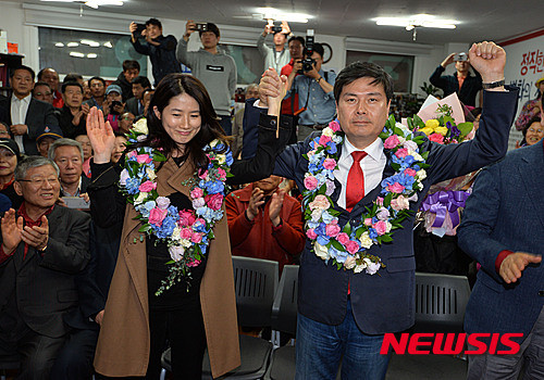 수수한 옷차림으로 참석한 심은하는 남편에게 환한 미소를 지으며 축하 인사를 건넨 뒤 함께 꽃목걸이를 걸고 사무실에 모인 지지자들에게 감사의 인사를 전했다. -