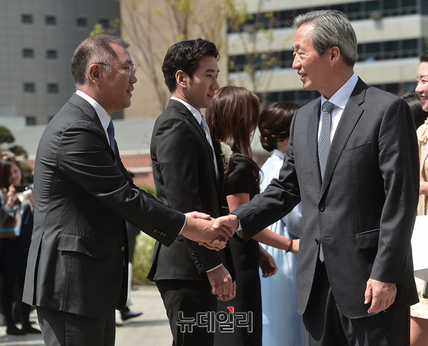 이날 현대차그룹과 애경그룹의 결혼식에는 정몽구 현대차그룹 회장, 현정은 현대그룹 회장, 정의선 현대차그룹 부회장, 정몽준 아산재단 이사장, 노현정 전 아나운서 등 범 현대가와 재계인사들이 총출동했다.