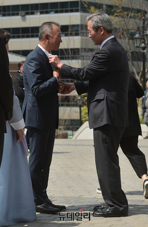 - ▲ 단체사진 촬영 기다리는 정몽준 이사장 내외 ⓒ 뉴데일리 정상윤