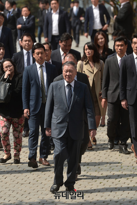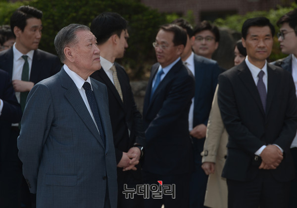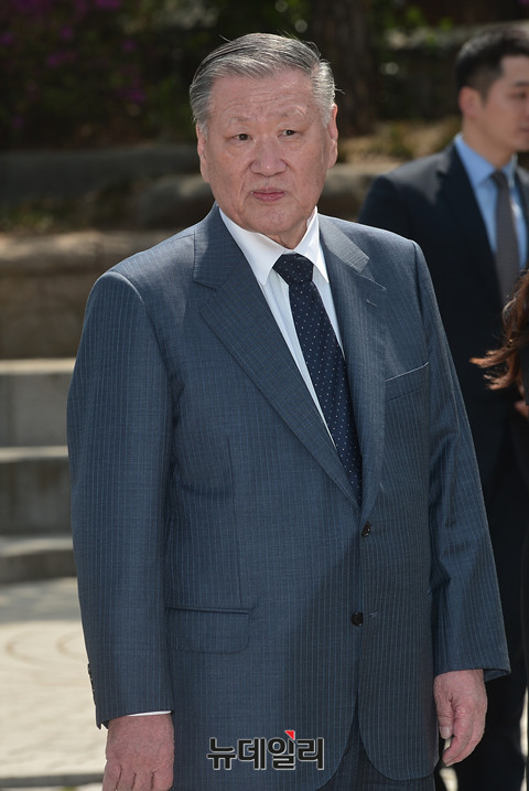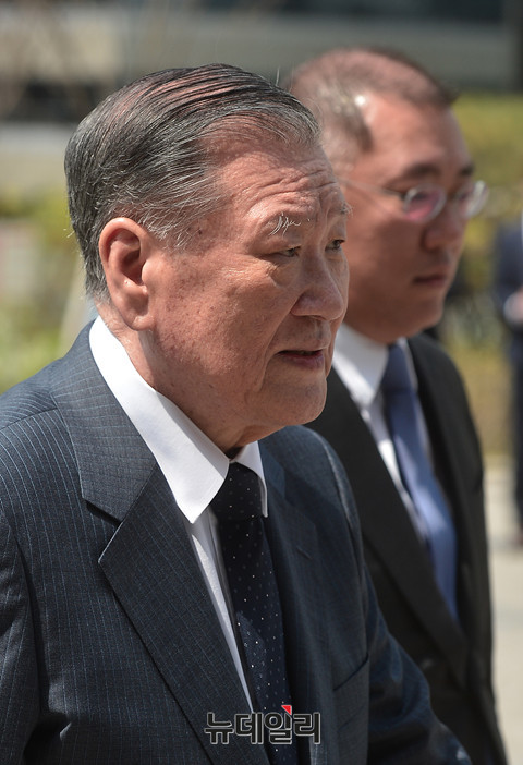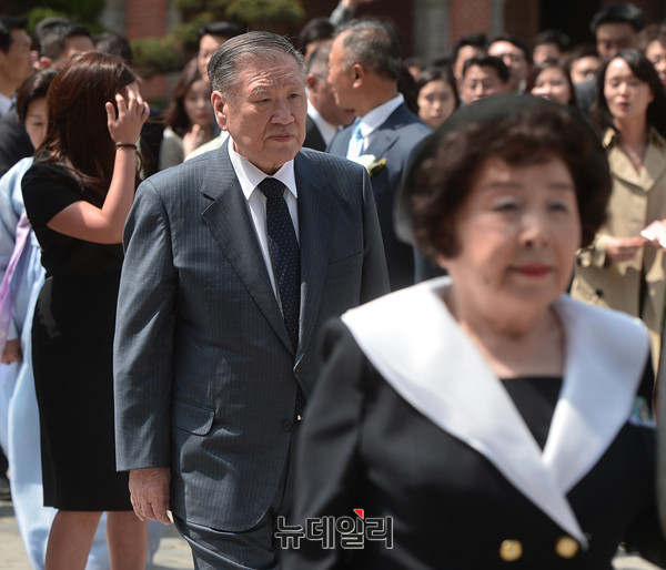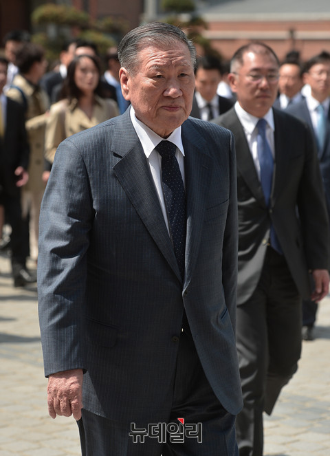 정몽구 현대차그룹 회장의 외손자 선동욱 씨와 채형석 애경그룹 총괄부회장 차녀 채수연 씨의 결혼식이 15일 오후 1시 서울 명동성당에서 진행됐다. 정몽구 현대차그룹 회장이 결혼식에 참석해 입장하고 있다.