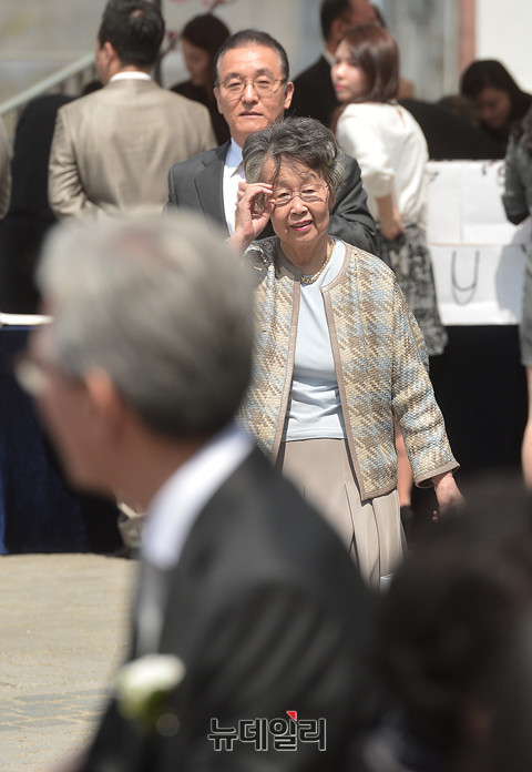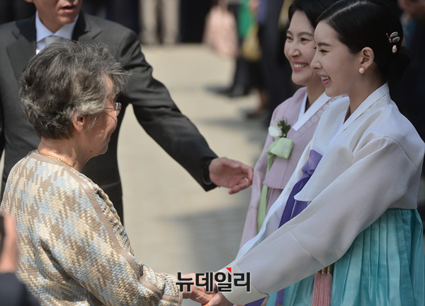 정몽구 현대차그룹 회장의 외손자 선동욱 씨와 채형석 애경그룹 총괄부회장 차녀 채수연 씨의 결혼식이 15일 오후 1시 서울 명동성당에서 진행됐다. 이인호 KBS이사장이 하객으로 참석해 혼주와 인사를 나누고 있다.
