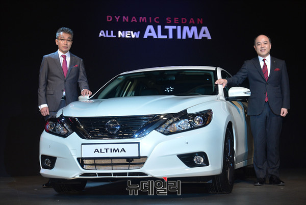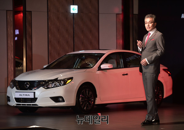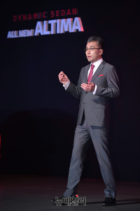 한국닛산이 19일 오전 서울 종로구 포시즌호텔 서울에서 다이내믹 세단 '올 뉴 알티마(All New Altima)' 출시 행사를 갖고, 국내 출시를 알렸다. '마사히데 아마다' 닛산자동차 상품개발총괄이 올뉴알티마를 설명하고 있다.