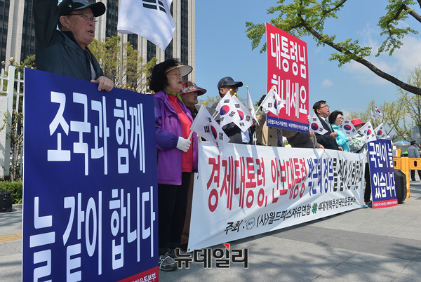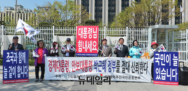 월드피스자유연합과 4대개혁추진국민운동본부가 9일 오전 서울 종로구 정부서울청사 앞에서 기자회견을 갖고, '경제·안보대통령 박근혜 대통령과 정부를 신뢰한다'고 밝혔다. 기자회견에 이어 오후 1시부터 청와대 앞에서 박근혜 대통령과 정부를 지지하는 피켓을 들고 1위 시위에 나섰다.