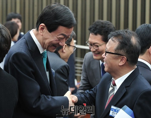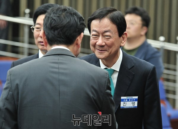 더불어민주당 진영 의원이 20일 오전 서울 여의도 국회에서 열린 당선자 대회에서 동료당선자들과 인사를 사를 나누고 있다.