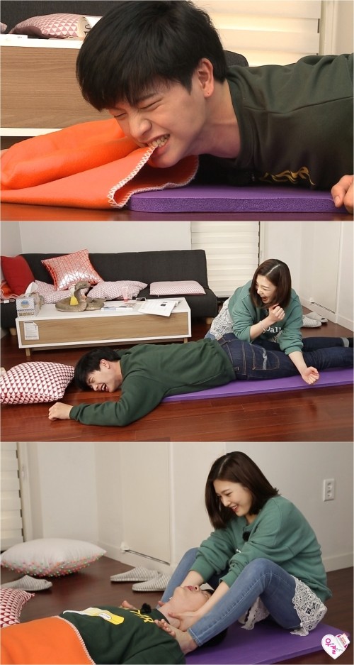 '우결' 육성재가 조이의 열혈 마사지로 굴욕을 당했다.23일 방송될 MBC '우리 결혼했어요-시즌4'(이하 '우결')에서는 평소 조이에게 마사지를 해달라고 졸랐던 육성재의 소원이 성취될 예정이다.공개된 사진 속 육성재는 매트 위에 누워 조이의 손길을 받으며 휴식을 취하고 있다. 그러나 육성재는 곧 본격적인 조이의 마사지에 담요를 입에 물고 비명을 참아내는 등의 모습으로 웃음을 자아낸다.이날 조이는 만반의 준비를 한 뒤 육성재 앞에 섰고, 책을 보고 연습한 손 동작들을 시연하는 등 남편을 향해 마사지 열의를 불태웠다. 하지만 마사지에 신이 나 "먼저 해준다고 하니까 좋았죠"라며 미소를 지었던 육성재의 최후는 참담했다.육성재는 엉덩이를 팔꿈치로 찍혀 "아픈데 왜 눌러"라고 토로했다. 이어 종아리와 겨드랑이 공격까지 당하며 결국 "누구의 소원인지 모르겠어요. 마사지 받는 사람의 기분이 좋아져야 되는데"라며 울부짖었다.조이는 이러한 육성재의 모습을 귀엽다는 눈빛으로 바라보며 "오빠가 아픈 건 뭉쳐서 그런 거야. 아파할수록 더 하래"라며 구슬렸고, "집중 공격에 들어가야겠어. 아프면 이거 물어"라며 담요를 건넸다. 이에 육성재는 담요를 물고 소리를 참아내며 조이의 마사지를 이겨냈다고.'쀼 커플' 조이 육성재의 달콤살벌한 마사지 데이트 현장은 23일 오후 4시 55분 MBC '우리 결혼했어요'를 통해 공개된다.['우리 결혼했어요' 육성재 조이, 사진=MBC]