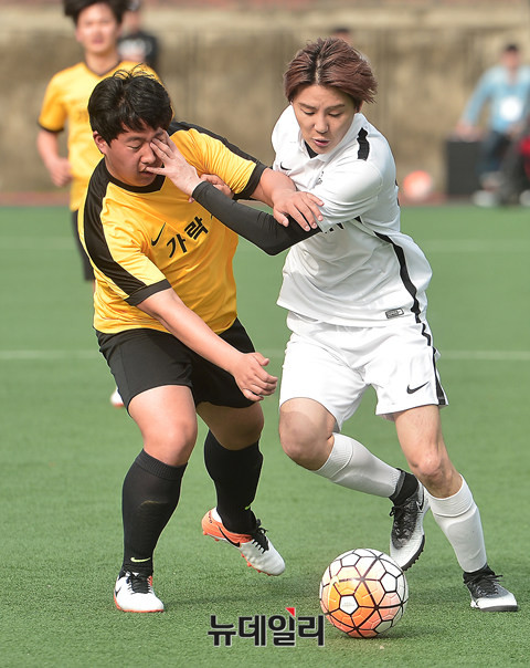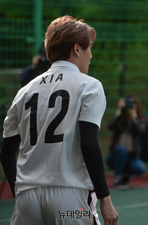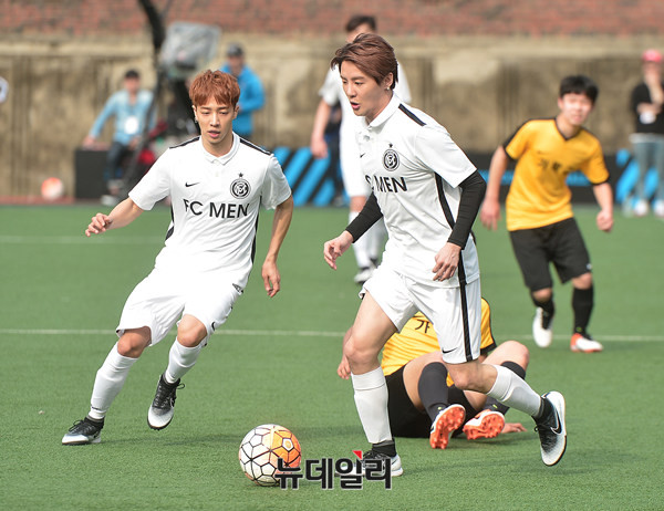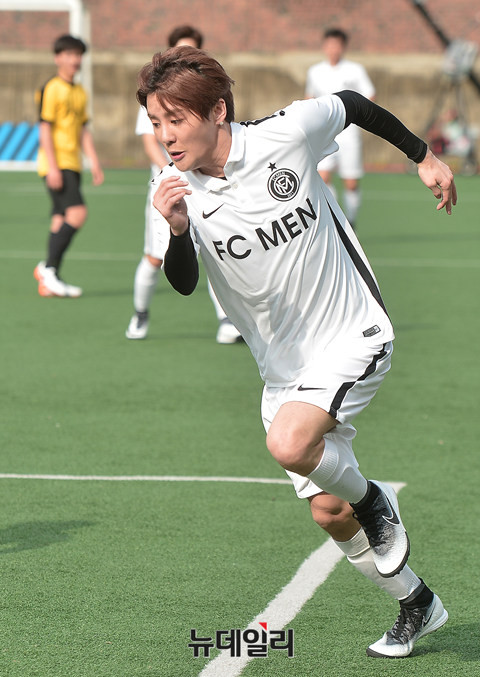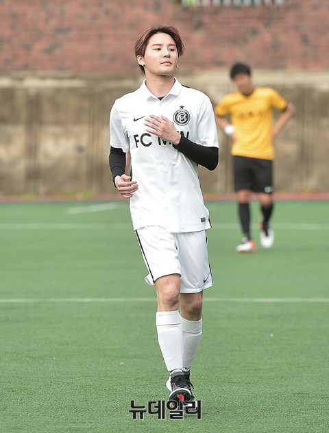 이날 연예인 축구팀 'FC MEN'과 가락고 학생팀의 본게임에서 김준수가 최전방 공격수로 나서 활약하고 있다.