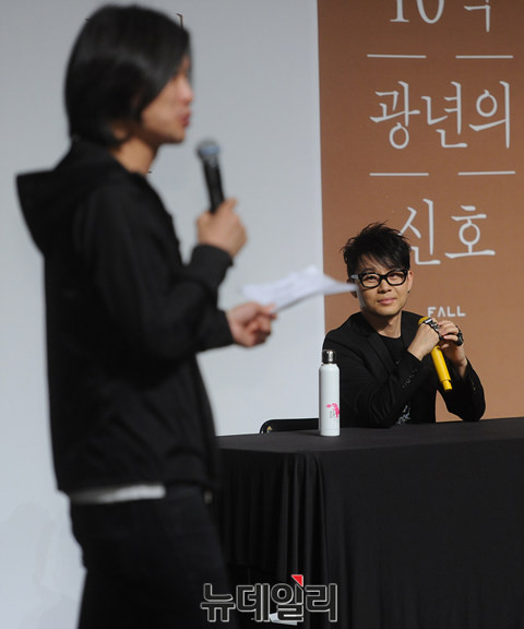 가수 이승환이 21일 오후 서울 서대문구 이화여대 삼성홀에서 신곡 '10억 광년의 신호' 발매 기자회견을 열었다. 이날 사회를 맡은 주진우 기자가 간담회를 진행하고 있다.