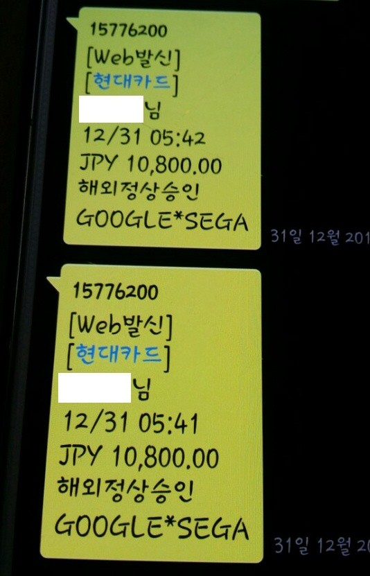 사업자 표시가 'GOOGLE*SEGA'로 찍힌 것으로 볼 때 해외에 있는 누군가가 게임아이템 앱을 소액결제로 구매한 듯 했다.