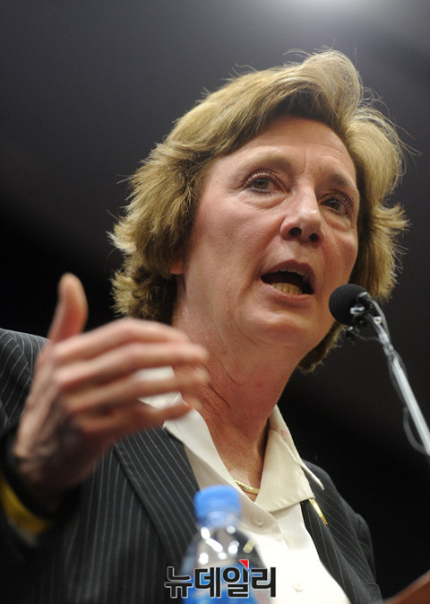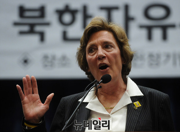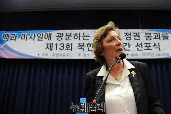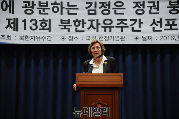수잔 숄티 북한자유연합 대표가 25일 오전 서울 여의도 국회 헌정기념관에서 열린 '제13회 북한자유주간 선포식'에 참석해 연설을 하고 있다.