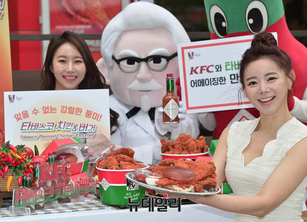 치킨 브랜드 KFC가 27일 오전 서울 종로구 KFC청계천점에서 신메뉴 '타바스코 치킨&버거'를 알리는 출시행사를 가졌다.
