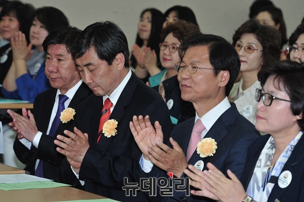 이종걸 더불어민주당 원내대표와 천정배 국민의당 공동대표가 27일 오후 서울 영등포구 이룸센터에서 열린 한국가정어린이집연합회 정기총회에 참석해 앉아 있다.