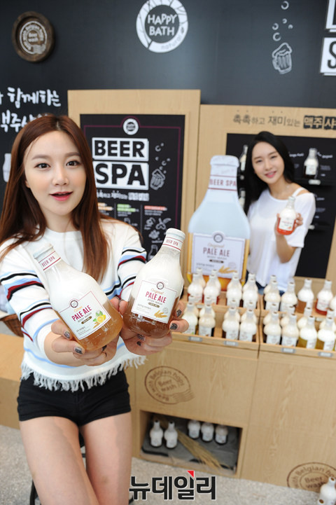 바디케어 브랜드 해피바스가 28일 오후 서울 강남역 아리따움 플래그십스토어에서 맥주와 벨기에산 홉 추출물이 함유된 '비어스파 바디워시' 출시를 기념하는 사진행사를 진행했다.