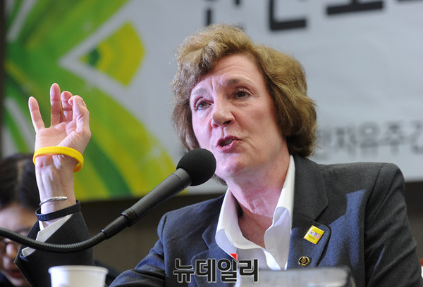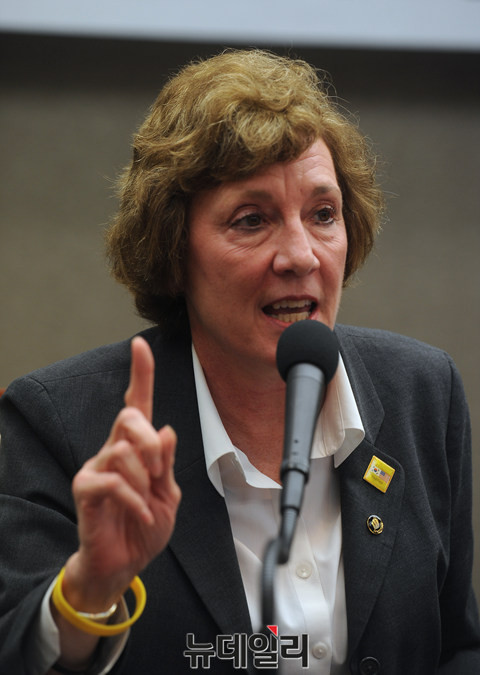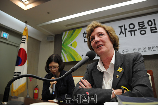자유통일을 위한 한미일 전략회의가 29일 오전 서울 중구 프레스센터에서 한미일 북한인권단테와 탈북자 단체 대표들이 모인 가운데 개최됐다. 이날 수잔 숄티 북한자유연합 대표가 인사말을 하고 있다.