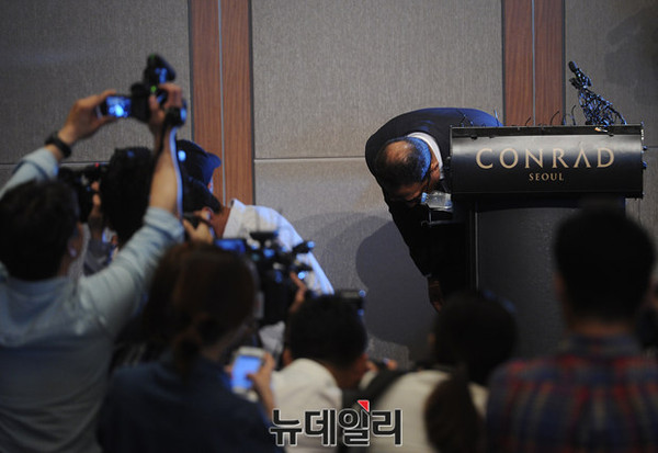 옥시레킷벤키저 한국법인 아타 사프달 대표가 2일 오전 서울 영등포구 여의도 콘래드 호텔에서 열린 가습기 살균제 관련 첫 기자회견에서 공식 입장을 발표후 피해자들에게 머리숙여 사과하고 있다.