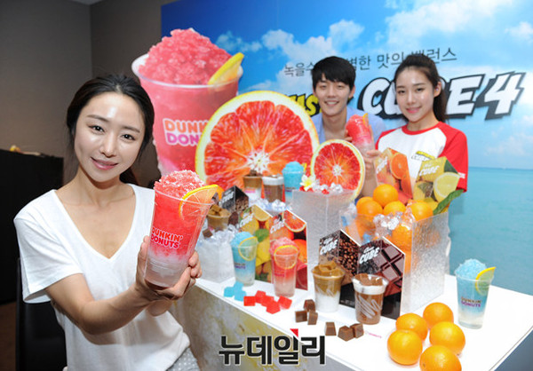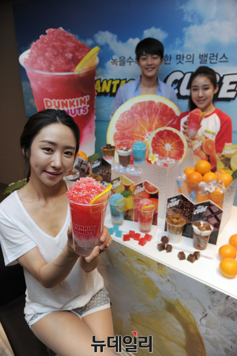 던킨도너츠가 3일 오전 중구 더플라자호텔 오크룸에서 다가오는 여름 시즌을 맞이하여 녹을수록 더욱 상큼한 맛을 자랑하는 ‘레드큐브’ 음료 출시 기념 행사를 갖고 남녀 모델들이 시원한 여름 복장을 하고 제품을 들고 포즈를 취하고 있다.