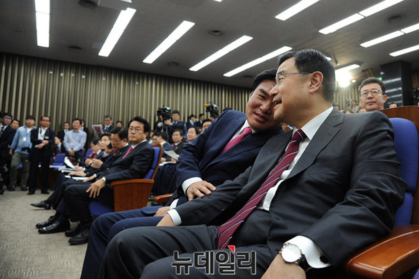 3일 서울 여의도 국회에서 열린 새누리당 2016 원내대표및 정책위원회의장 선출 당선자 총회 회의장에서 원유철 원내대표와 김정훈 정책위의장이 이야기를 나누고 있다.