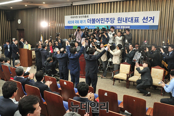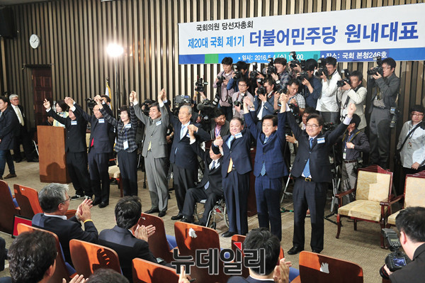 더불어민주당 원내대표 경선이 4일 오후 서울 여의도 국회에서 열린 가운데 원내대표 후보로 출마한 이상민, 강창일, 우상호, 노웅래, 민병두, 우원식 의원이 손을들어 인사를 하고 있다.