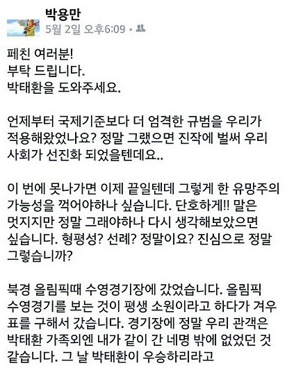 평소 스포츠매니아로 알려진 박 회장은 지난 3일 "언제부터 국제 기준보다 더 엄격한 규범을 우리가 적용했느냐"며 "정말 그랬으면 진작에 벌써 우리 사회가 선진화 됐을 것"이라는 사견을 페이스북에 올렸다.