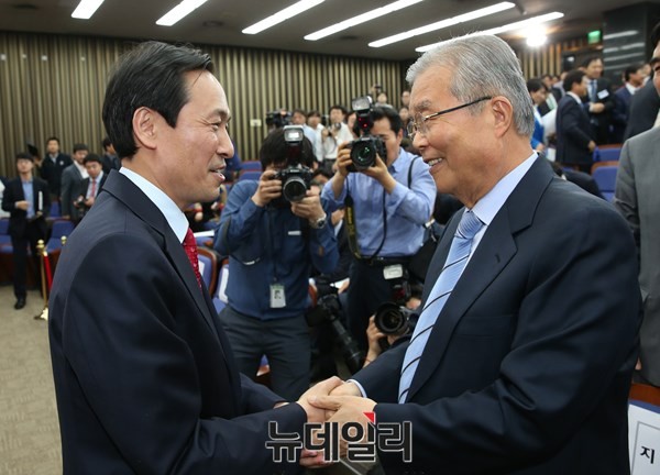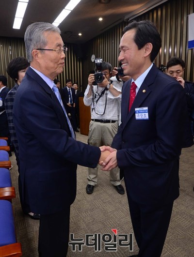 더불어민주당 원내대표 선거가 4일 오후 서울 여의도 국회에서 열린 가운데 신임 원내대표로 선출 된 우상호 의원이 김종인 대표와 인사를 나누고 있다.