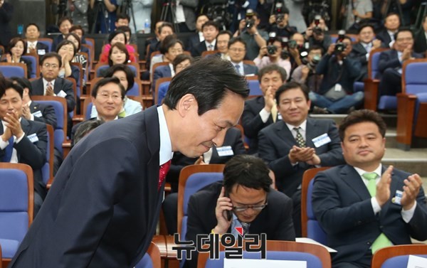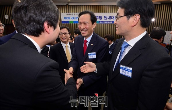 더불어민주당 원내대표 선거가 4일 오후 서울 여의도 국회에서 열린 가운데 신임 원내대표로 선출 된 우상호 의원이 동료의원들에게 축하를 받고있다.