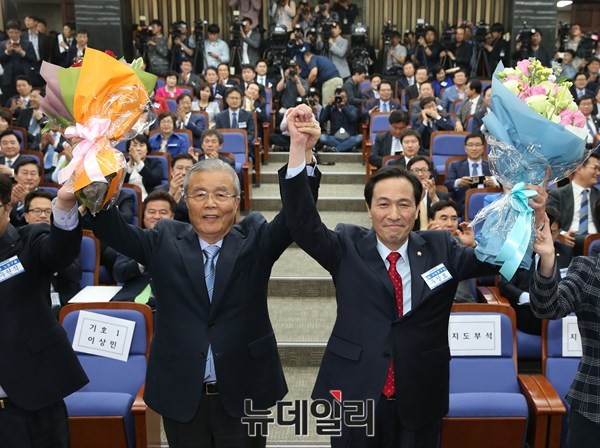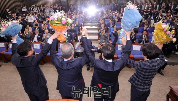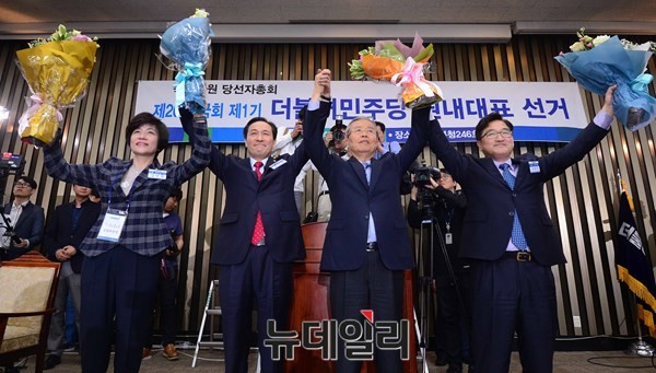 더불어민주당 원내대표 선거가 4일 오후 서울 여의도 국회에서 열린 가운데 신임 원내대표로 선출 된 우상호 의원(왼쪽 두번째)이 김종인 대표, 김영주 선관위원장, 우원식 의원과 손을들어 인사하고 있다.