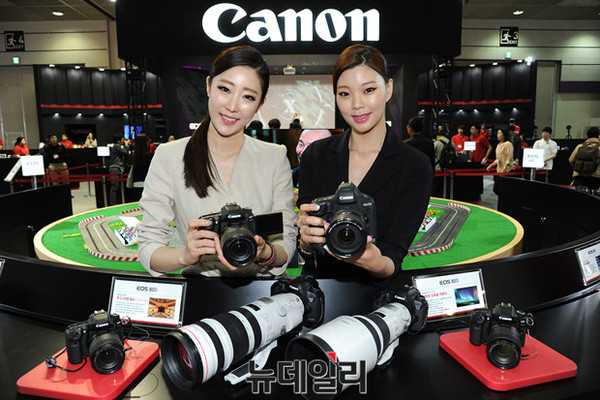 캐논코리아컨슈머이미징이 4일 오전 서울 삼성동 코엑스에서 열린 ‘제25회 서울국제사진영상기자재전’에서 캐논의 플래그십 디지털일안반사식(DSLR) 카메라 ‘EOS-1D X Mark II’와 프리미엄 중급 DSLR ‘EOS 80D'를 선보이고 있다.