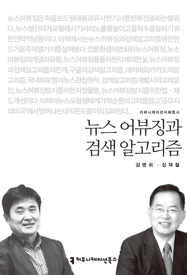 뉴스 어뷰징과 검색 알고리즘 : 뉴스 어뷰징과 검색 알고리즘에 관한 뜨거운 주제 열 가지를 담아냈다. 언론 환경의 변화와 뉴스 어뷰징, 뉴스 어뷰징의 개념과 유형, 뉴스 어뷰징을 둘러싼 각계의 현실, 뉴스 어뷰징과 검색 알고리즘의 관계, 구글의 검색 알고리즘, 네이버와 카카오의 알고리즘, 국내외 포털의 뉴스 편집 원칙, 검색 알고리즘 개발 시의 고려 요인, 뉴스 어뷰징 방지를 위한 자정 활동, 뉴스 어뷰징 방지를 위한 법·제도 개선 등이 주요 골자.<저자 소개>