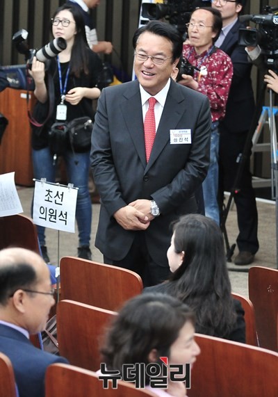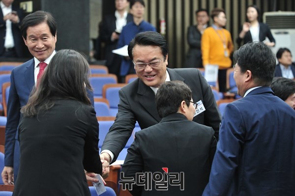정진석 새누리당 원내대표가 10일 오전 서울 여의도 국회에서 열린 '초선의원 연찬회'에 참석해 초선의원들과 대화를 나누고 있다.