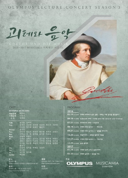 독일의 대문호 요한 볼프강 폰 괴테의 인생과 명작을 가곡의 미학으로 재해석해 선보이는 '렉처 콘서트 시즌 3'를 시작한다렉처 콘서트는 올림푸스한국이 지난 해 4월부터 앙상블 무지카미아(Musicamia)와 함께 진행해온 문학과 음악이 함께 하는 기획공연이다.앞서 시즌 1에서는 독일 낭만주의 대표시인들의 작품 세계를, 시즌 2에서는 작곡가 브람스의 명곡을 테마로 진행한 바 있다.세 번째 시즌의 주인공 괴테는 '파우스트', '빌헬름 마이스터' 등 세계적인 대작을 남긴 독일 문학의 거장이다. 그의 시는 음악가들에게 지속적으로 영감을 제공해 모차르트, 베토벤, 슈베르트, 브람스 등 수 많은 거장들에 의해 음악으로 재탄생됐다.이번 렉처 콘서트에서는 괴테 가곡의 역사, 음악으로 만나는 괴테의 명작들, 괴테가 사랑했던 음악 등을 주제로 전문적인 해설을 곁들여 쉬우면서도 깊이 있게 소개할 예정이다.'렉처 콘서트 시즌 3'는 오는 19일 첫 공연을 시작으로 내년 2월까지 매월 1회, 총 10회에 걸쳐 진행한다. 티켓 가격은 전석 3만3천원이며, 공연에 대한 자세한 정보는 올림푸스홀 웹사이트에서 확인할 수 있다.[사진=올림푸스한국]