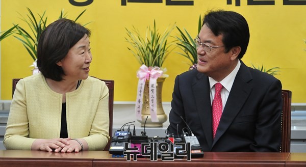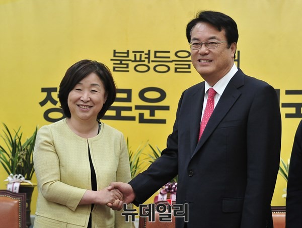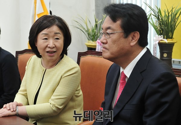정진석 새누리당 원내대표가 11일 서울 여의도 국회 정의당 대표회의실을 찾아 심상정 정의당 대표와 대화를 나누고 있다.