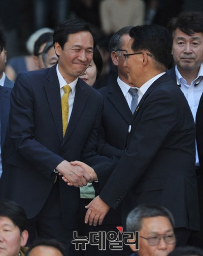 국민의당 박지원 원내대표가 17일 오후 광주공원 일원에서 열린 제 36주년 '5.18' 전야제에 참석해 더불어민주당 우상호 원내대표와 악수를 나누고 있다.
