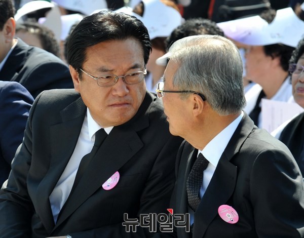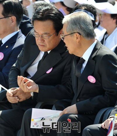 김종인 더불이민주당 대표가 18일 오전 광주 국립5.18민주묘지에서 열린 36주년 5.18 민주화운동 기념식에 참석해 새누리당 정진석 원내대표와 대화를 나누고 있다.