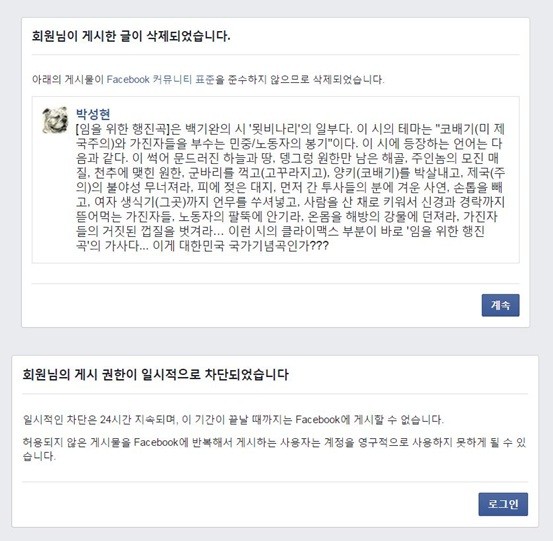 박성현 주필은 "18일 오전 11시경 민중·노동자의 봉기를 테마로 쓰여진 시, '묏비나리(백기완 著)'의 클라이막스 부분이 바로 '임을 위한 행진곡'의 가사라는 사실을 지적한 글이 갑자기 삭제되고, 글쓰기(게시) 권한이 24시간 정지되는 처분을 받았다"며 "페이스북이 무슨 이유로 이 글을 삭제하고 사용자의 권한까지 정지시켰는지 자세한 정보를 알려주기를 요청한다"고 밝혔다.