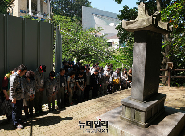 앞서 19일 오후 울릉도 약수공원 내 있는 안용복장군충혼비를 찾아 참배했다. (경북 울릉=뉴데일리 정상윤)