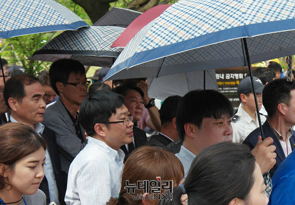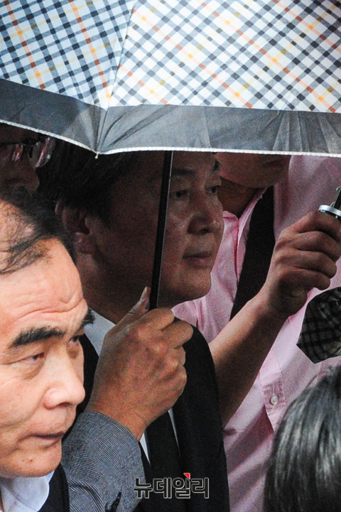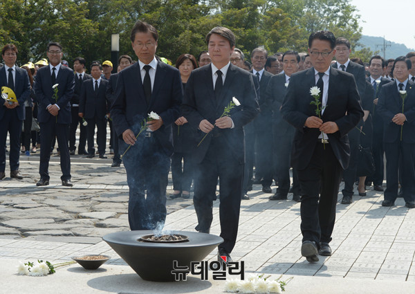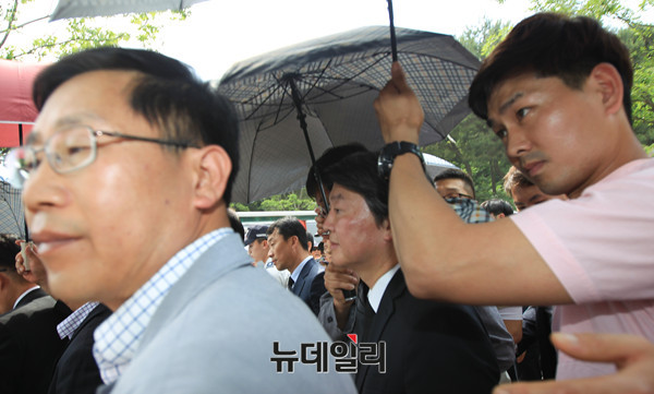 추모행사를 마친뒤 헌화·분향이 이어진 묘역까지 경호원들이 우산을 펴고 안 대표와 국민의당 지도부를 경호했다.