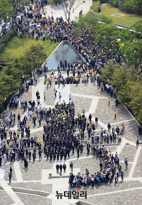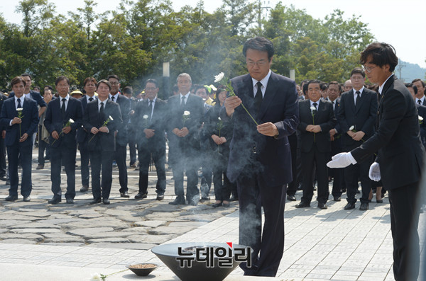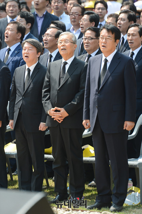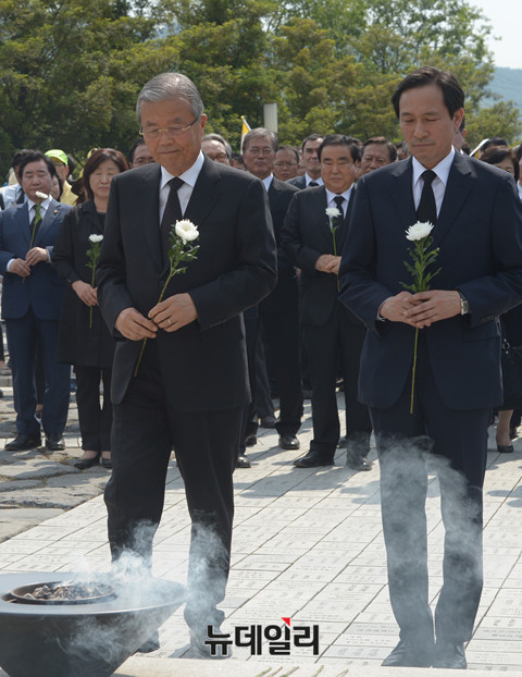 새누리당 정진석 원내대표, 더불어민주당 김종인 비상대책위 대표, 국민의당 안철수-천정배 공동대표를 비롯한 삼당 지도부들이 23일 오후 김해 봉하마을에서 열린 故노무현 전 대통령 7주기 추도식에 참석했다. 이들은 추모행사를 마친 뒤 묘역을 찾아 헌화·분향했다.